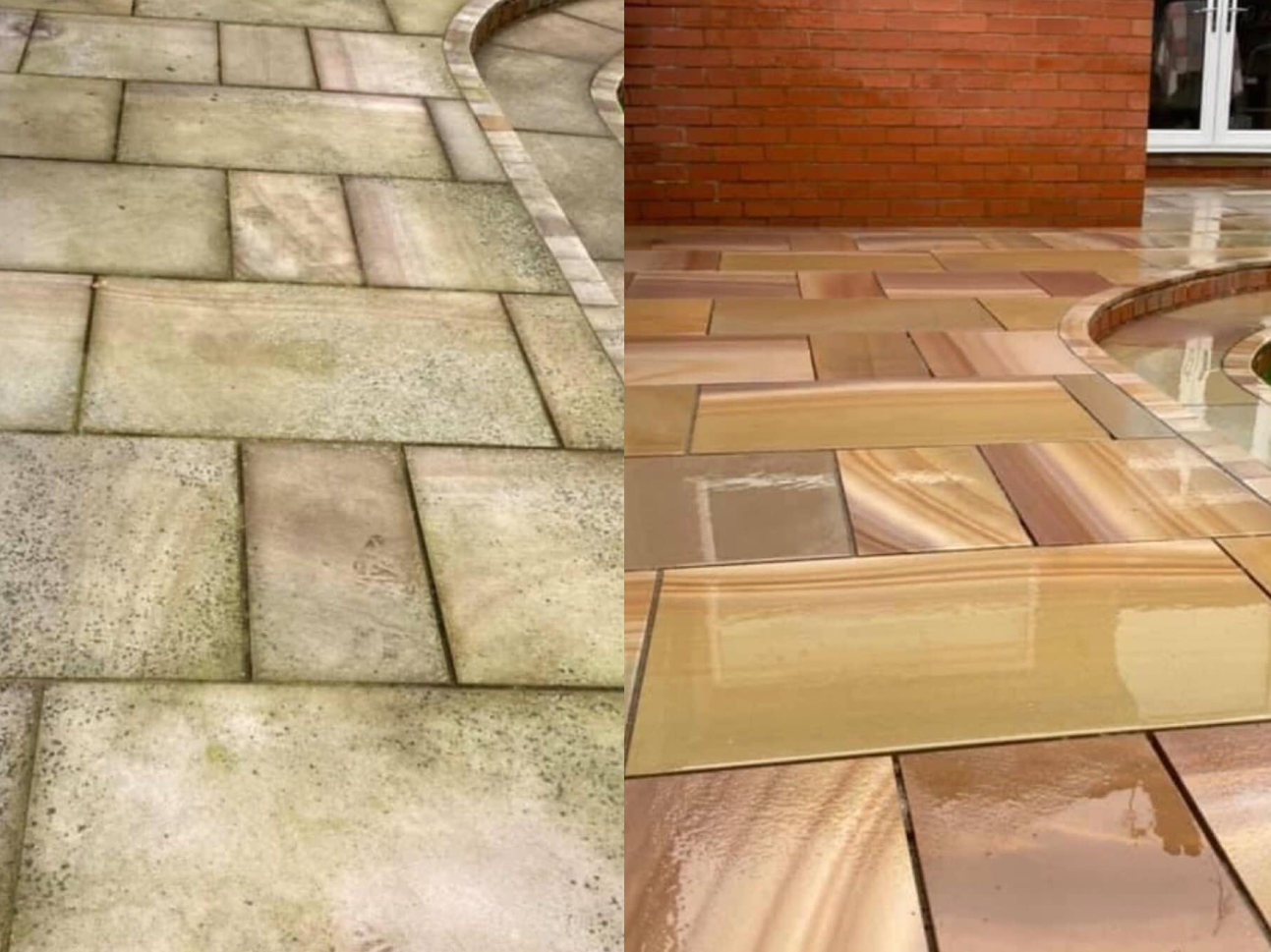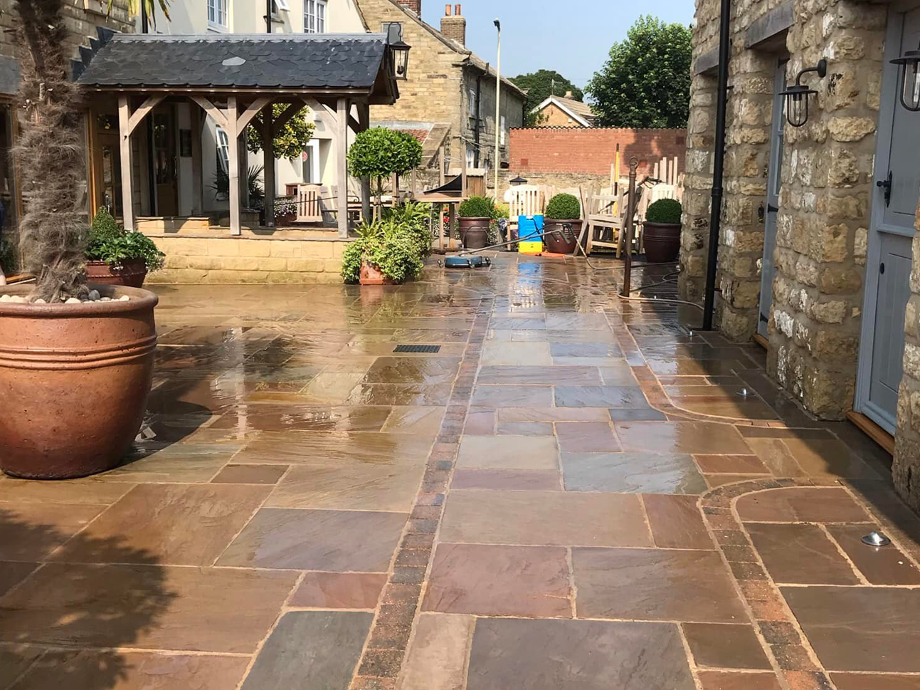 Jet n Vac Exteriors provide a comprehensive patio cleaning service that efficiently cleans the wide range of materials currently used for patio construction. Whether your patio is blocked paved, Indian stone, imprinted concrete, Yorkstone slabs or crazy paved we can restore the faded colour, remove weeds and algae growth and make the whole area look as good as new.